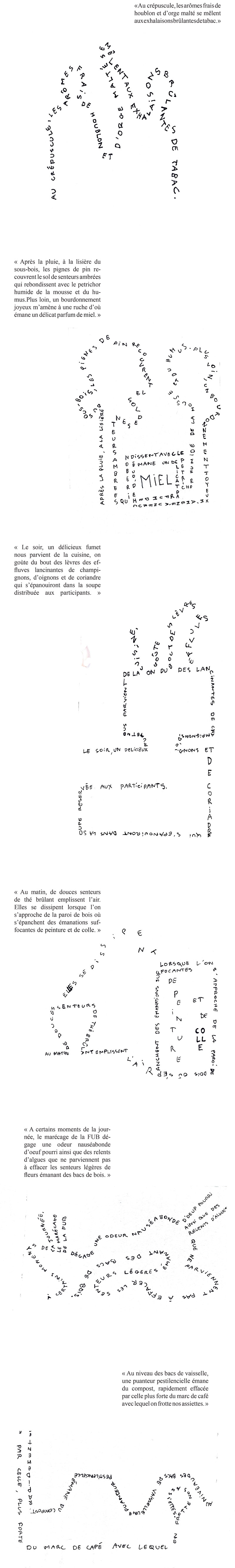 La Floating University Berlin est un nuage. Un nuage à la fois en expansion et en régression. Parfois, des fumerolles s’étendent vers le ciel et agrandissent le nuage.Parfois, les vapeurs se rétractent et le nuage se désenfle. Ces mouvements de dilatation et de compression sont le fruit de nombreux processus à l’œuvre sur le site et en dehors. Il s’agit ici d'en faire un état des lieux au travers du prisme de l’odorat. Une telle approche sensitive du lieu permet de comprendre en quoi une odeur est le résultat d’une suite d’opérations, aboutissant à une production. Si l’on s’intéresse à ces perceptions, on peut prendre conscience des processus à l’œuvre à la Floating University Berlin. Cette contemplation olfactive s’exprime à travers une série de calligrammes qui rendent compte de quelques impressions (re)senties au cours de la semaine, traduisant les événements prenant place ici ( recyclage, sociabilisation, production artistique… ). Ces perceptions immatérielles traduisent encore l’idée d’un nuage, en mouvement et en transformation constante. Malgré tout, un jour, la Floating University Berlin se transformera en pluie et tombera sur la terre. Peut être pour former un nouveau nuage ailleurs ?