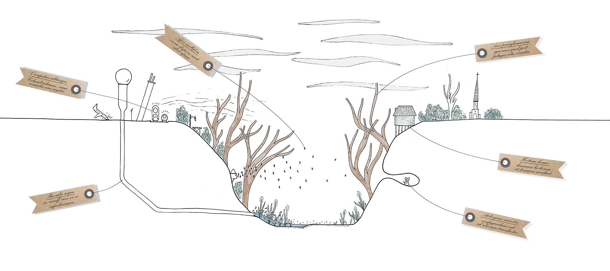 Secret Haven is a naive cross section of the Floating University. This childish slicing of the ground emphasizes natural, topographical, biological or anthropological aspects which contribute to this secret and hidden atmosphere. This image is the result of my feelings for this place as experienced during these three days. I was able to pinpoint several obvious visual and audible elements. The more important an element is, the larger it will be. This both scientific and approximative document tries to give an account of a unique landscape atmosphere enhanced by the FUB’s presence. Indeed, this alternative university puts a banal retention basin at the heart of a new architectural and social facility. I wanted to depict this place because it moved me. I was moved thanks to the workshops that took place during the week-end at the FUB, revealer of forsaken places.